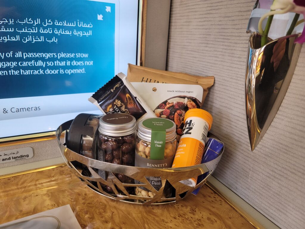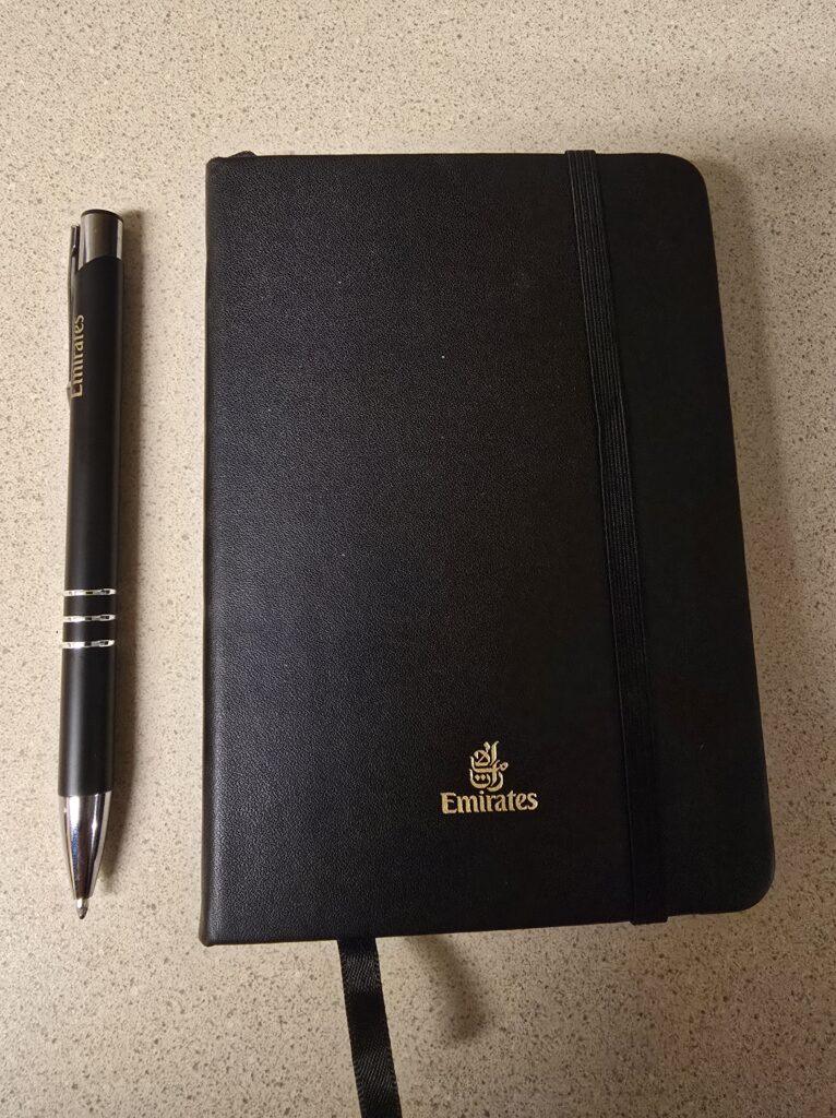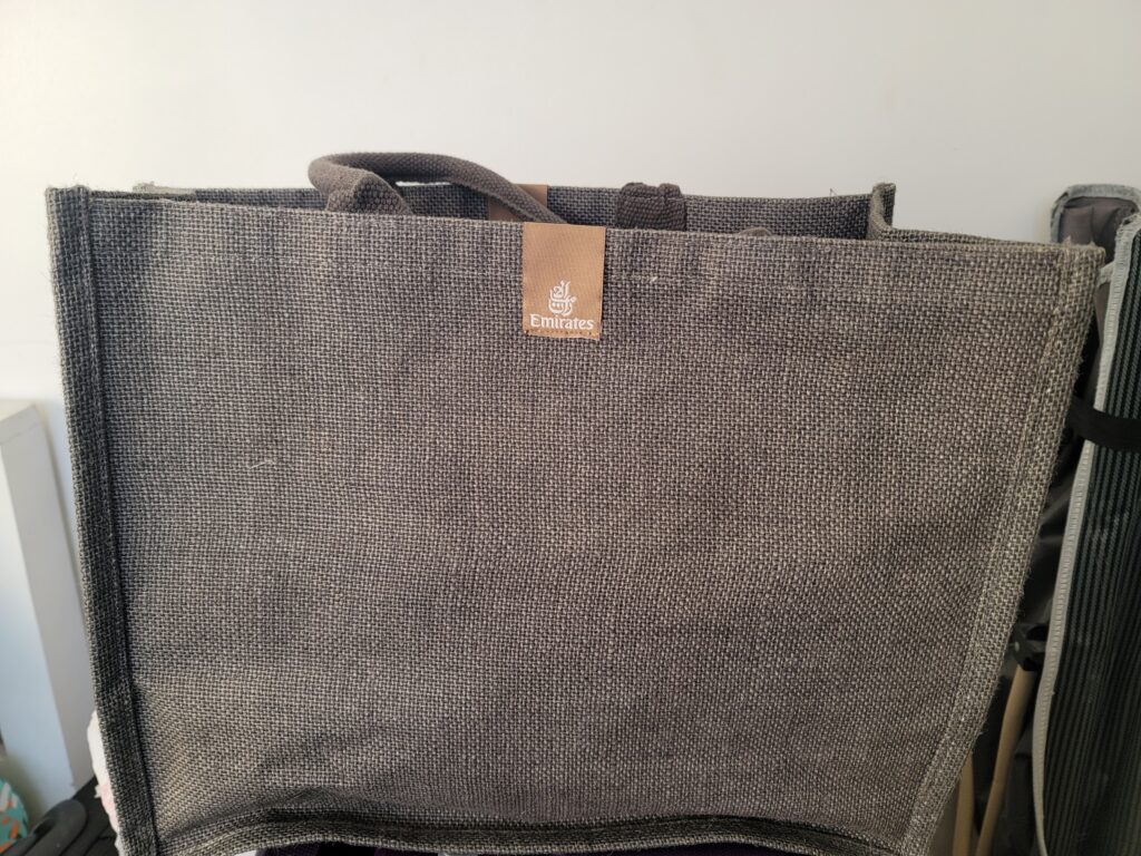 They gave me a kit with toiletries and asked if I would like a pair of pajamas. Along with the pajamas, the attendant gave me a bag that I could use to carry all the items they gave to me. Emirates is the only airline that I know that gives a bag with their amenities and that is something I really appreciate.
