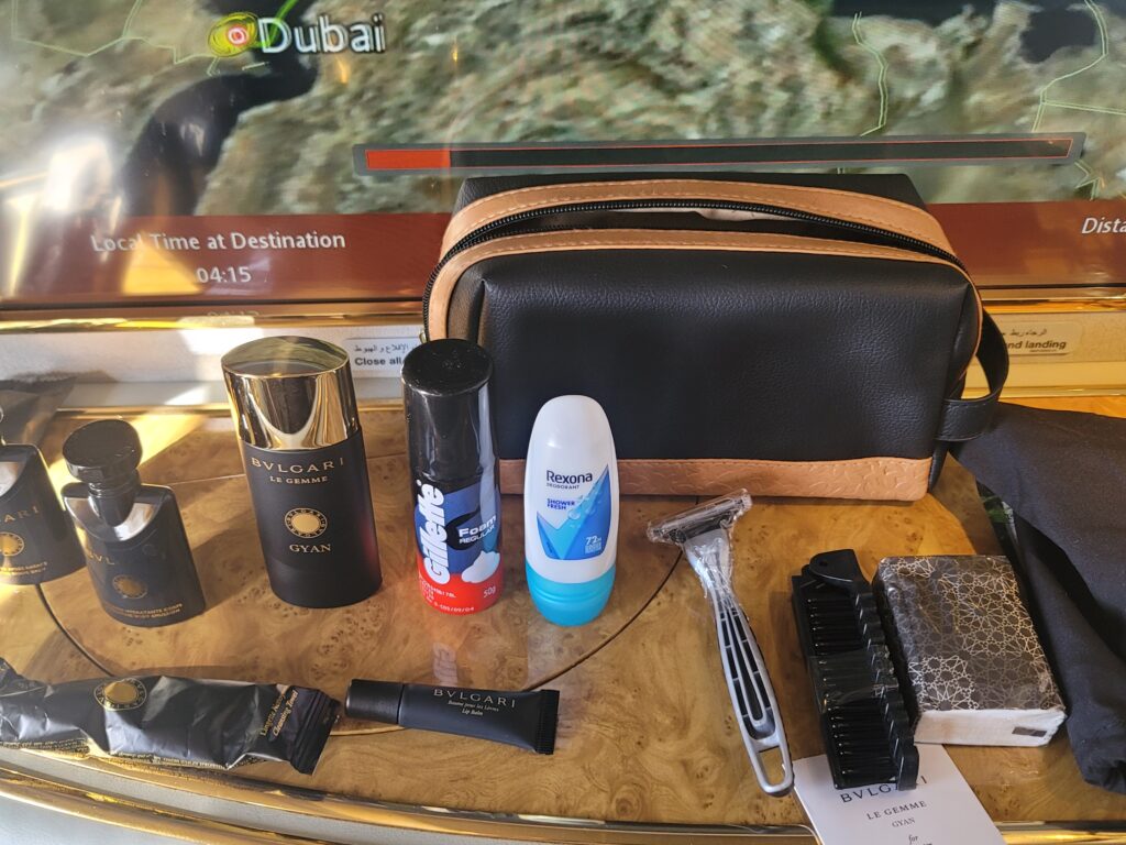 Unfortunately, they changed the contents of the toiletry kit early this year. They still have Bulgari cologne, but, unlike the cologne shown above (from January 2024), I find the odor of the new cologne to be unpleasant. One of the attendants told me they also changed the contents of the woman’s bag.