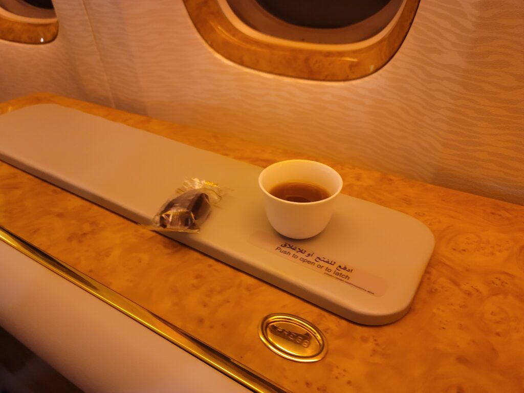 Shortly before take-off, two attendants offered me coffee service. They had a box with 3 types of dates. They offered me a date and fragrant Arabic coffee.