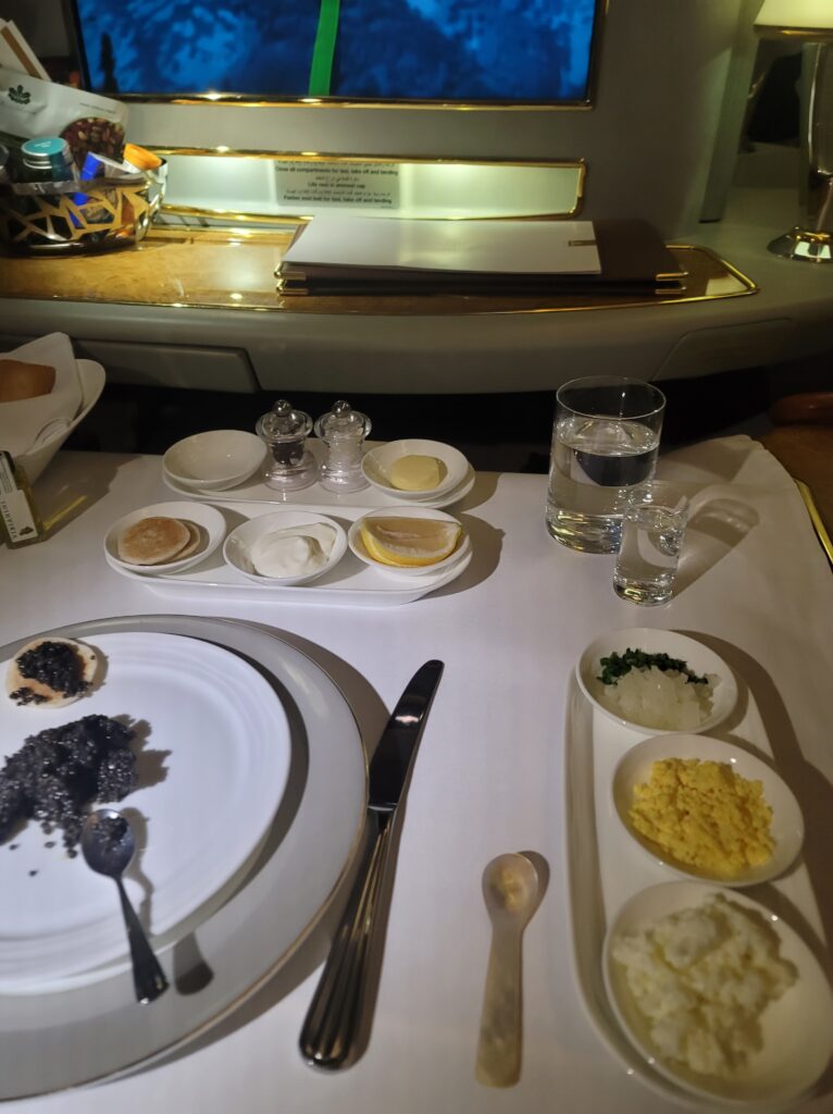 After we were in the air, I ordered caviar. This was maybe the 4th time in my life I ate caviar. In the past, I didn’t like it at all, but I have been told Emirates only serves the best. I wanted to see if it was really as good as I have heard.