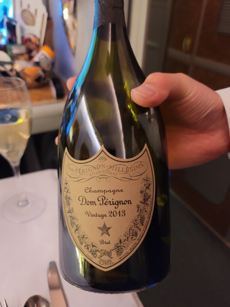 One of the flight attendants asked me what I would like to drink. When I said, “champagne”, she immediately broke out the Dom Pérignon. I read someplace that they are not allowed to open the Dom Pérignon until after take-off. The attendant told me that depends upon the airport of departure and in most cases, they are now allowed to serve it on the ground.
